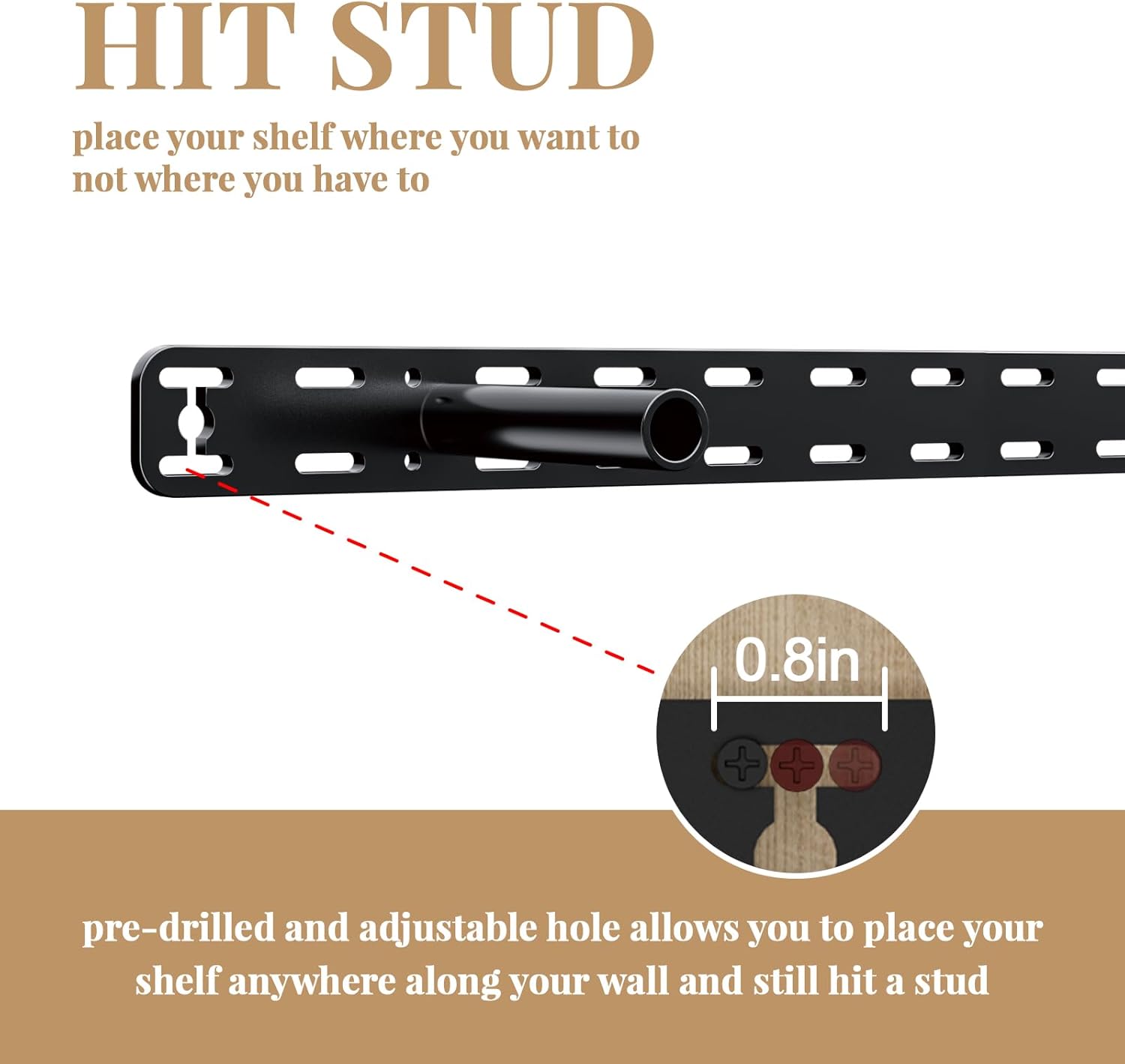【Stud Mounted Shelf Bracket】Our humanized design features pre-drilled holes over 0.8 inches, offering flexibility for accurate alignment with load-bearing beams. Superior to single-hole designs, our adjustable hole function adapts to various environments without wall damaged. Easy-to-use matching stud ensure stable, simple, and convenient installation, making our mantel brackets the top choice for efficient, worry-free, and safe home storage.