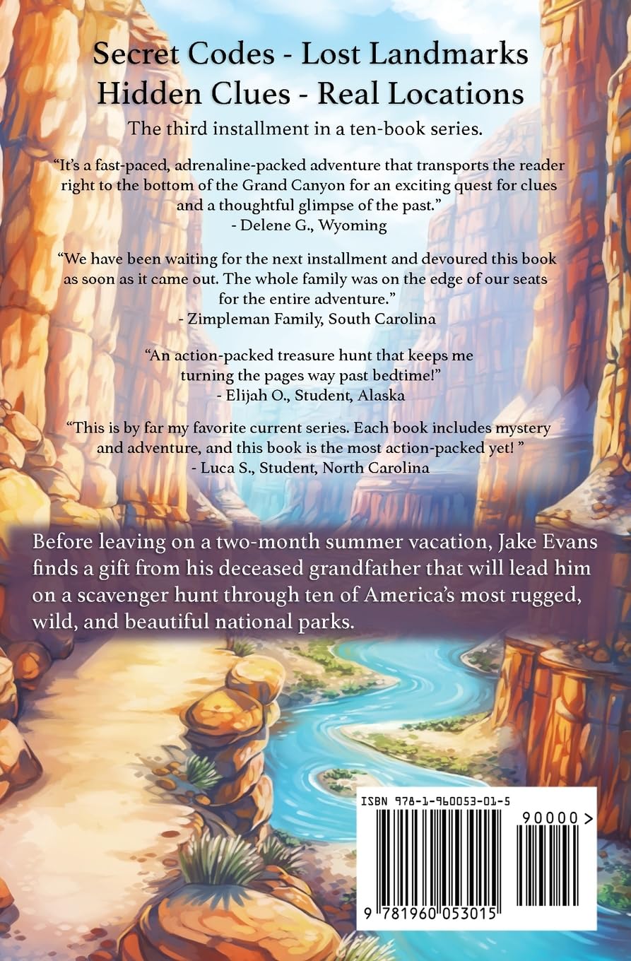 Before Jake’s grandfather died, he was on the trail of a centuries-old mystery. And he has entrusted that mystery to Jake, leaving behind a set of hidden codes, riddles, maps, and other clues that lead Jake and his friends on a scavenger hunt while camping in the most wild and rugged wilderness of the national parks.