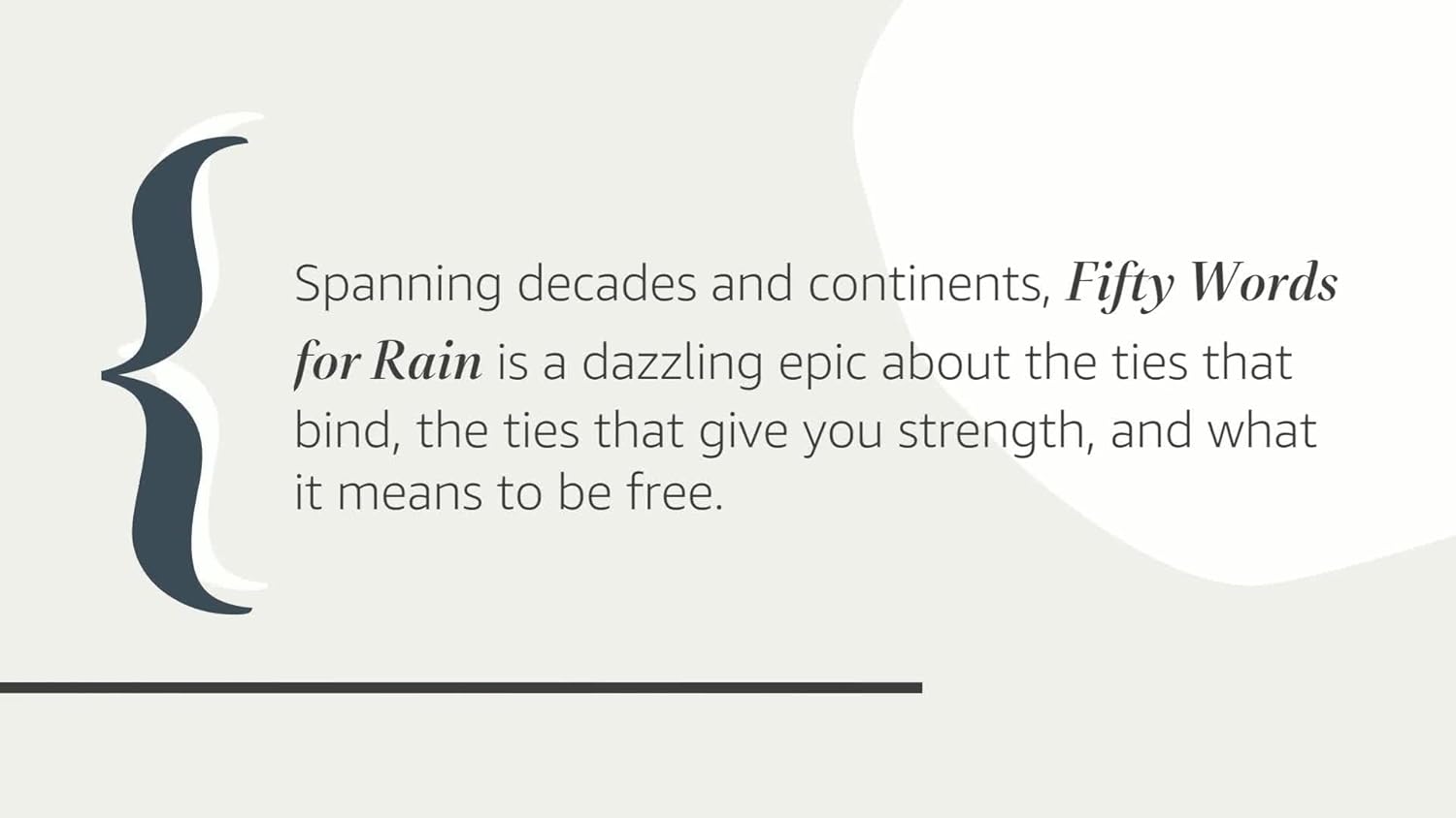 Spanning decades and continents, Fifty Words for Rain is a dazzling epic about the ties that bind, the ties that give you strength, and what it means to be free.