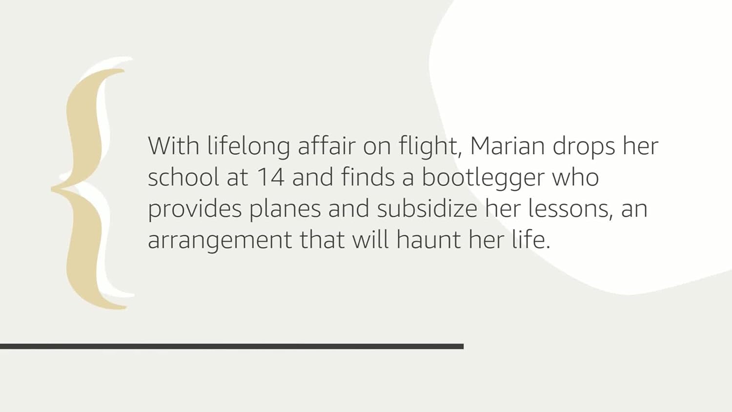 After being rescued as infants from a sinking ocean liner in 1914, Marian and Jamie Graves are raised by their dissolute uncle in Missoula, Montana. There–after encountering a pair of barnstorming pilots passing through town in beat-up biplanes–Marian commences her lifelong love affair with flight. At fourteen she drops out of school and finds an unexpected and dangerous patron in a wealthy bootlegger who provides a plane and subsidizes her lessons, an arrangement that will haunt her for the rest of her life, even as it allows her to fulfill her destiny: circumnavigating the globe by flying over the North and South Poles.