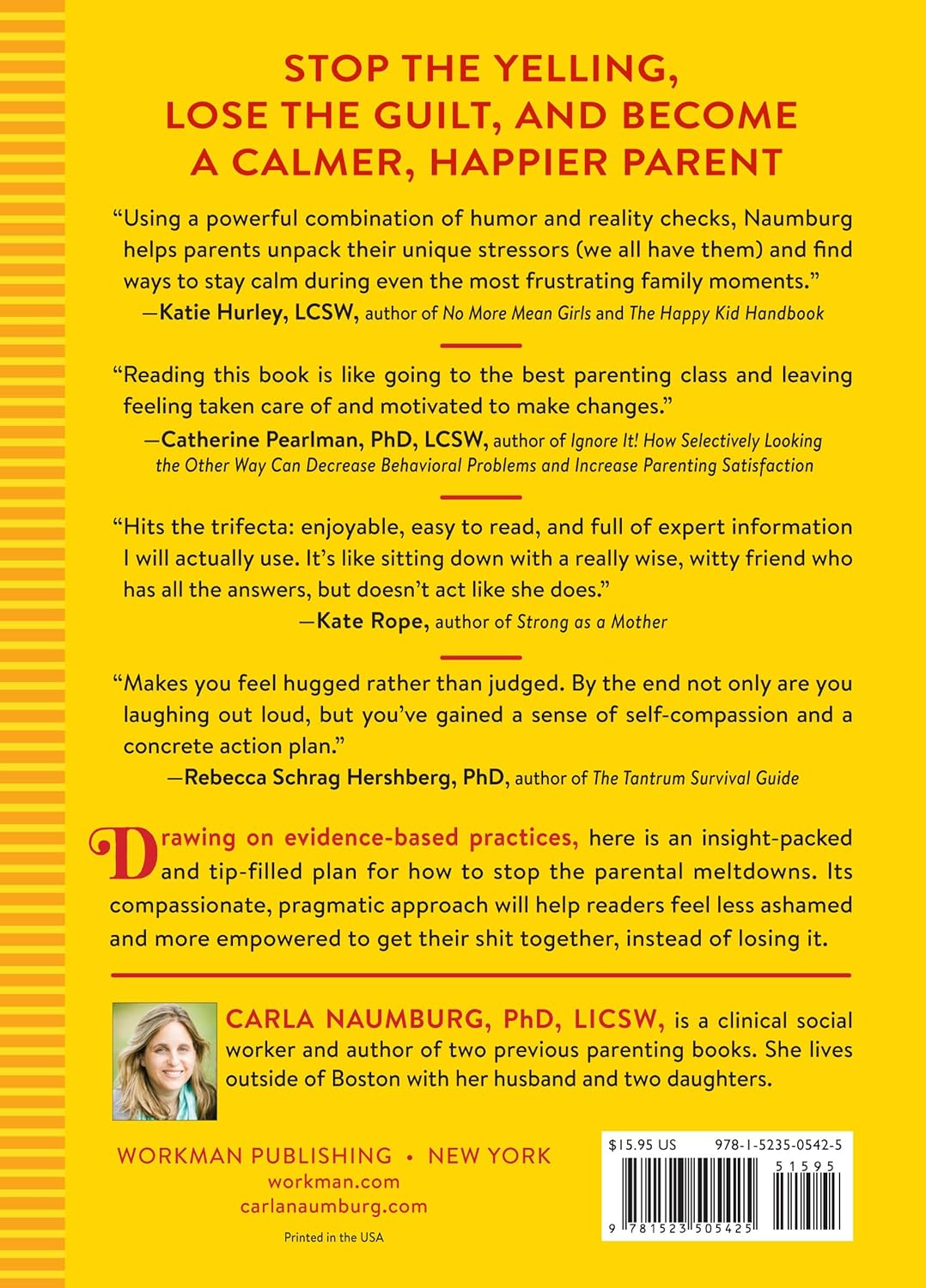 “Using a powerful combination of humor and reality checks, Naumburg helps parents unpack their unique stressors (we all have them) and find ways to stay calm even the most frustrating of family moments.” —Katie Hurley, LCSW, author of No More Mean Girls and The Happy Kid Handbook