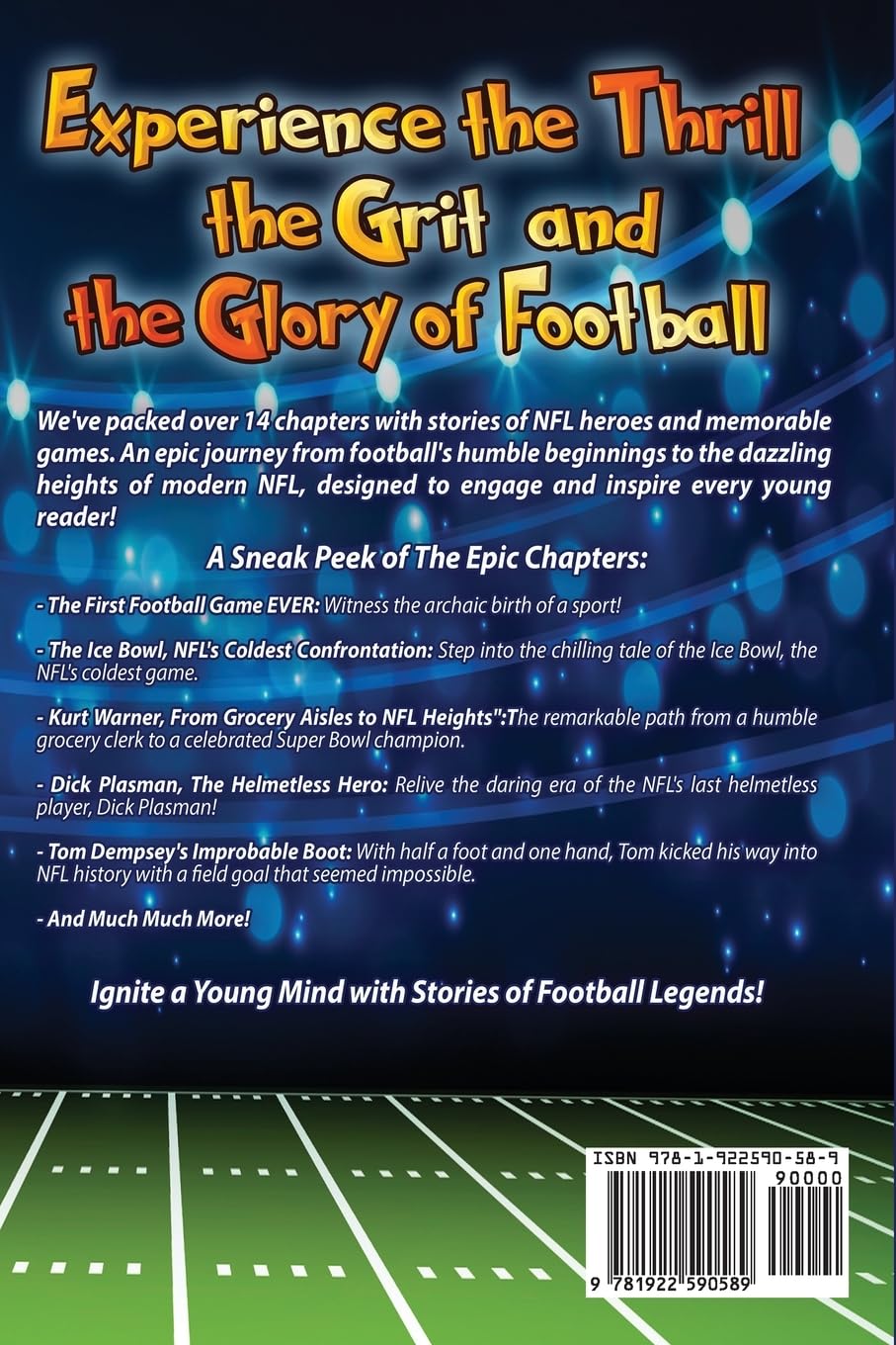 Here’s A Sneak Peek at Some of the Epic Chapters:The First Football Game EVER: Witness the archaic birth of a sport!The Ice Bowl, NFL’s Coldest Confrontation: Step into the chilling tale of the Ice Bowl, the NFL’s coldest game.Kurt Warner, From Grocery Aisles to NFL Heights: The remarkable path from a humble grocery clerk to a celebrated Super Bowl champion.Tom Brady’s Super Bowl LI Comeback: From a massive deficit to a legendary Super Bowl victory.The Dolphins’ Untouched Season: How did they create this unbroken record of perfection?Dick Plasman, The Helmetless Hero: Relive the daring era of the NFL’s last helmetless player, Dick Plasman!Tom Dempsey’s Improbable Boot: With half a foot and one hand, Tom kicked his way into NFL history with a field goal that seemed impossible.And Much Much More!This Book is a Playbook of Inspiration! Engaging and Easy-to-Read narratives for young minds.Lessons in Mental Toughness: Empowering stories that foster resilience and a strong mindset.Motivational Stories: that instil perseverance and team spirit.Fun Nonfiction Adventures: that educate while keeping the excitement high.Gift a World of Football and Motivation!