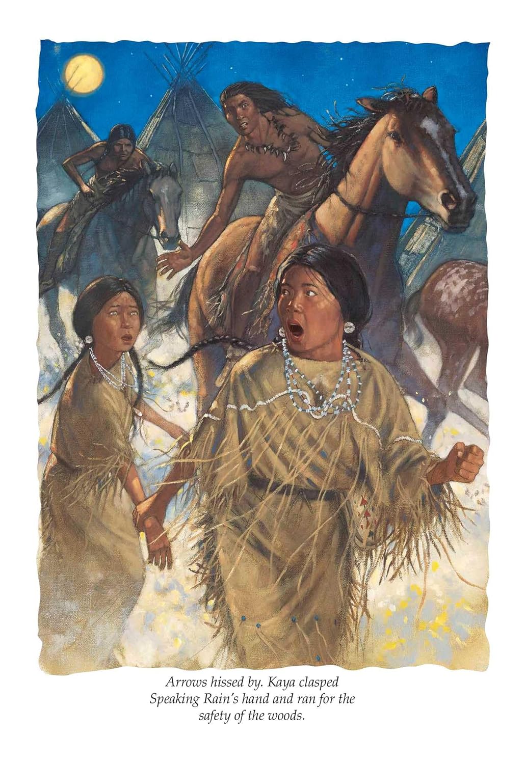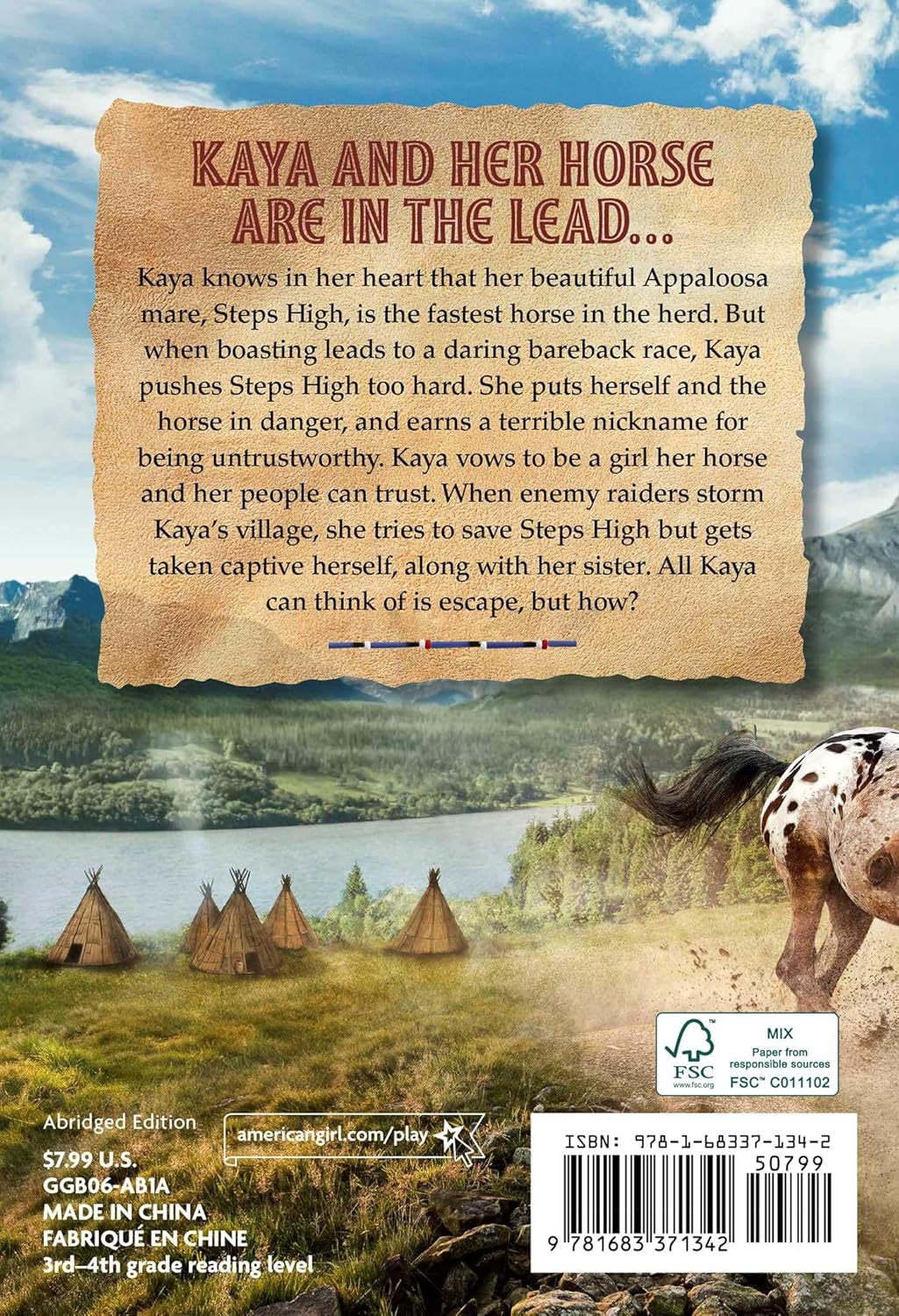 Kaya knows in her heart that her beautiful Appaloosa mare, Steps High, is the fastest horse in the herd. But when boasting leads to a daring bareback race, Kaya pushes Steps High too hard. She puts herself and the horse in danger and earns a terrible nickname for being untrustworthy. Kaya vows to be a girl her horse and her people can trust. When enemy raiders storm Kaya’s village, she tries to save Steps High but gets taken captive herself, along with her sister. All Kaya can think of is escape, but how?