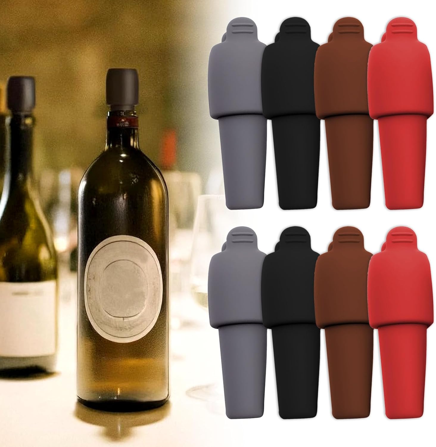 Wide Applications: Versatile and functional, these silicone wine stoppers are suitable for various beverages, including wine, beer, and champagne. Available in multiple colors—red, black, gray, and brown—our wine bottle stoppers are crafted from high-quality silicone, making them reusable and perfect for home kitchens or commercial bars